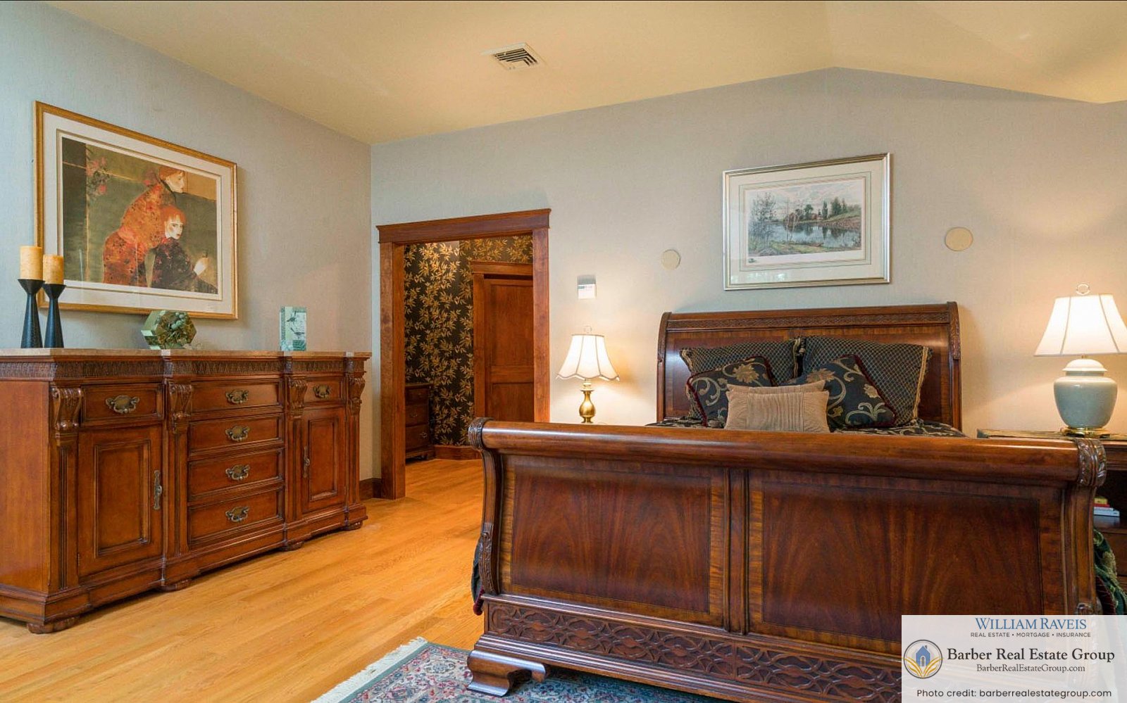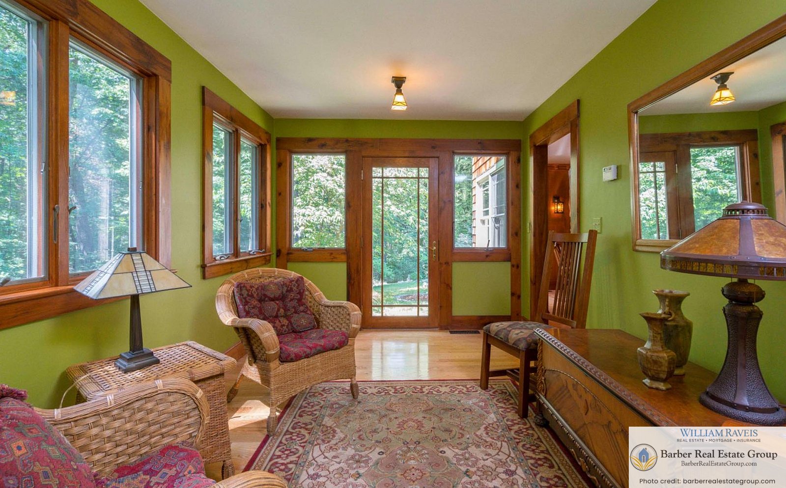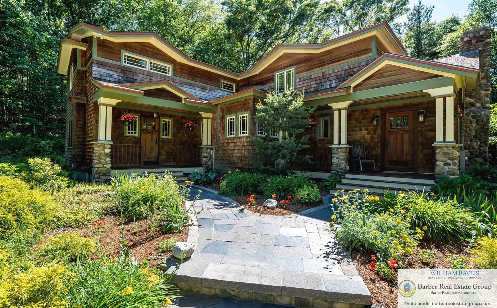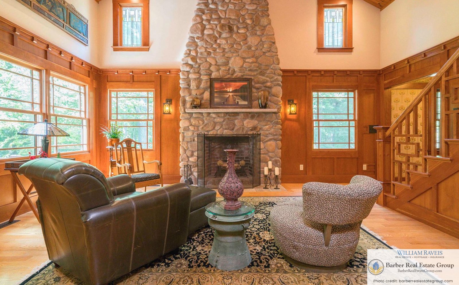 This homage is most evident in the living room, where a stately river stone fireplace and Craftsman-style wood wainscoting take center stage. The same meticulous attention to detail continues throughout the home, especially in the kitchen and dining room, where rich woodworking and period-inspired wallpaper add warmth and authenticity.